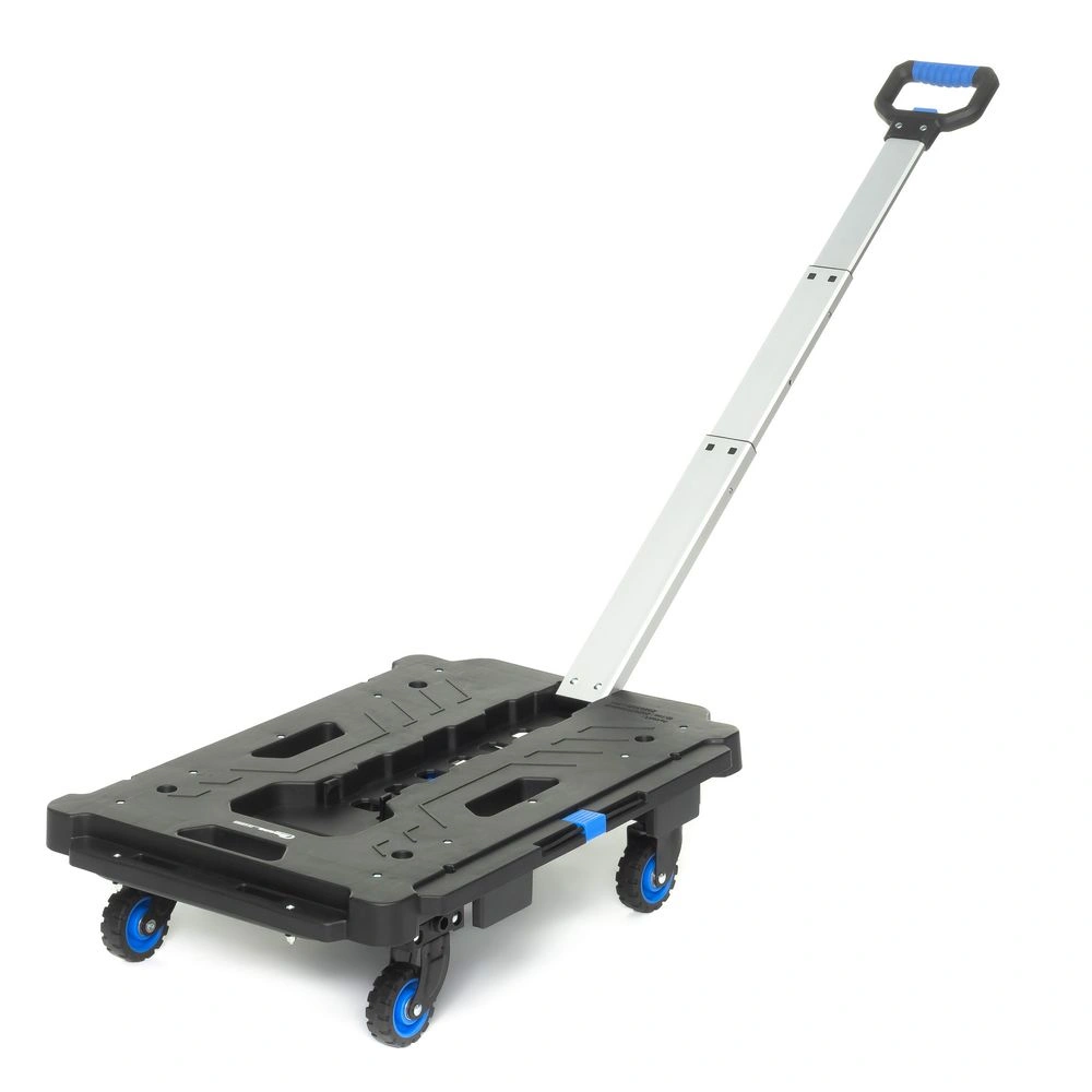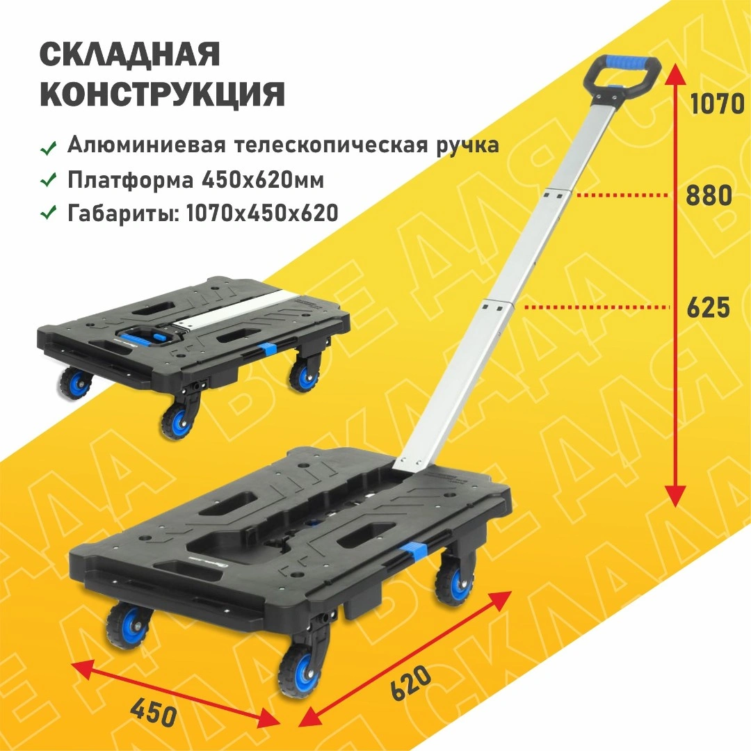 Размер платформы 450х620 мм. Высота платформы от поверхности перемещения (клиренс) 16 см. Регулировка ручки по высоте возможна в трех положениях и составляет от платформы: 46,5; 72 и 91 см. Общая высота тележки с ручкой в положениях: 1. - 62,5 см; 2. - 88 см.; 3.- 107 см. Габариты тележки в сложенном, транспортировочном состоянии: 450х620х107 мм. Вес 5,4 кг.